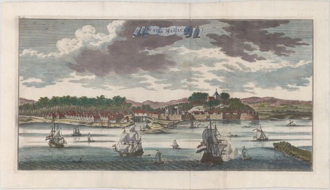 This copper-engraved view depicts the city of Malacca, with numerous ships sailing the Straits of Malacca. Valentyn was a prominent historian of the Dutch East India Company who is best known for Oud en Nieuw Oost Indien, his vast illustrated account of the Dutch trading empire in Asia. He twice traveled to the East Indies and served as Calvinist minister to Ambon between 1686 and 1694. In preparing this monumental work, he was given privileged access to the previously secret archives of the VOC, containing transcripts and copies of important earlier Dutch voyages. On two sheets, joined.