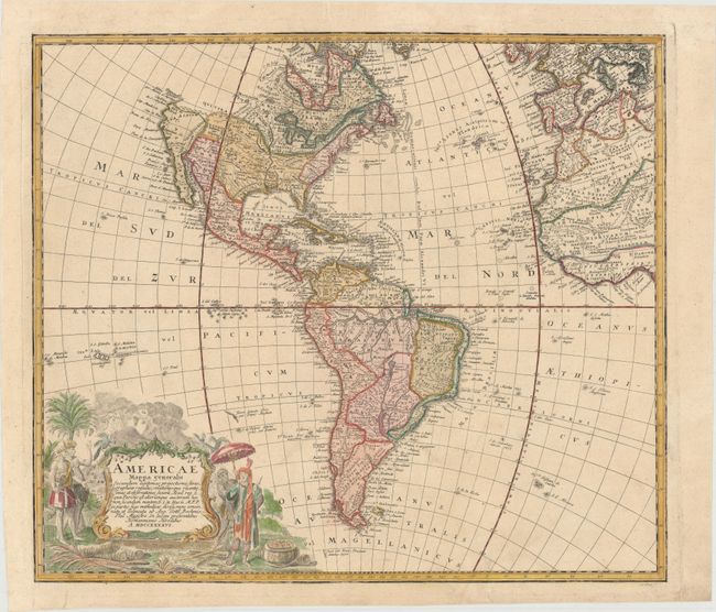 This is a handsome, decorative eighteenth century map of the Americas with considerable detail throughout. It extends to the western part of Africa and southwest Europe. There is only an amorphous coastline shown above the peninsular California, with the Pacific Northwest left blank. The very large title cartouche includes two erupting volcanoes, Native Americans, palm trees, sugar cane, parrots, and a pot of gold. Johann Matthias Haas was a professor of mathematics at Wittenberg, and he worked with the Homann Heirs updating their map stock.