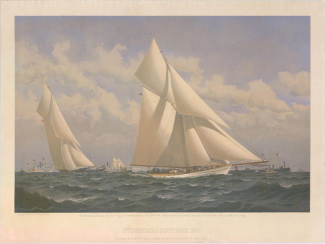 This lot includes two yachting scenes based on watercolor paintings by Frederic Schiller Cozzens, an American artist known primarily for his maritime scenes. The first is a lithograph depicting the yachts Volunteer, an American vessel, and Thistle, a British vessel, after the start of the 1887 International Yacht Race. This lithograph was created by Armstrong & Co. in Boston and published by C. L. Jones & Co.