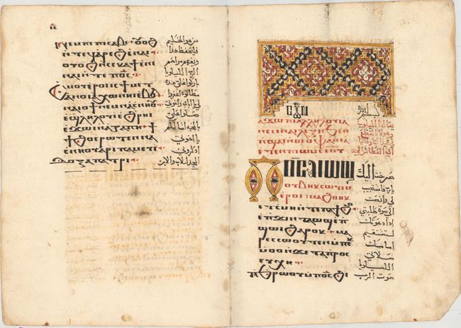 This very fine manuscript bifolium is from a Coptic-Arabic lectionary written in Egypt in the early part of the 17th century. The bifolium is embellished with superb Coptic decoration. The text is written in two columns, Coptic with an Arabic translation, in black, red and yellow ink. These are very rare, museum quality leaves.