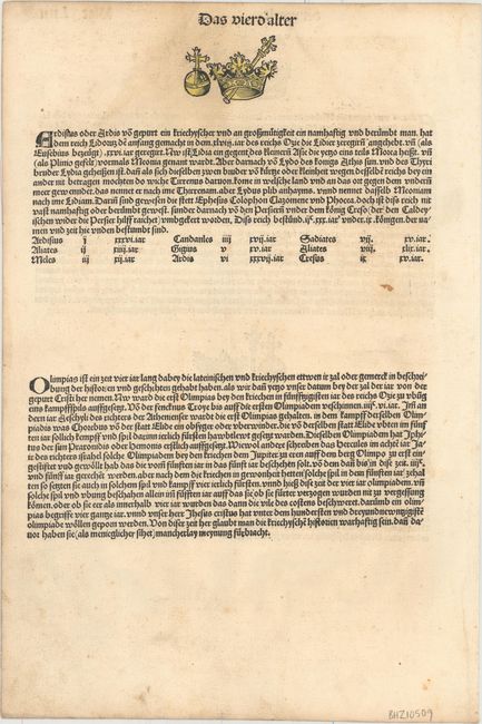 The recto and verso of this sheet of German text depict crowns, orbs, and scepters with text related to the empires and kingdoms of the Medes, Macedonia, and Lydia, as well as the origin of the Olympic Games.