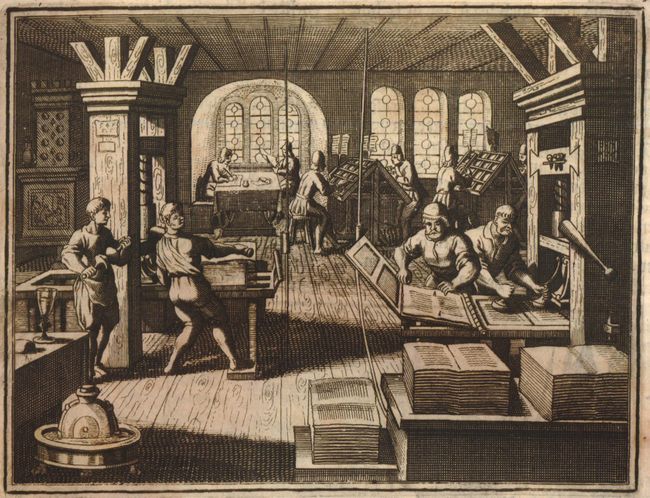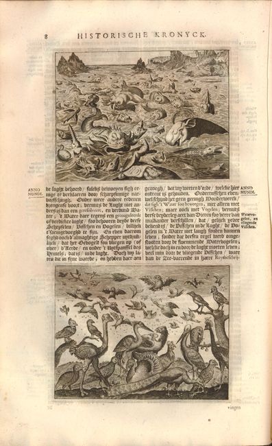 This is a fascinating World Chronicle by Johann Gottfried, translated from German to Dutch by Simon de Vries and published by Pieter van der Aa. The book covers the time period from the Creation until the 16th century and covers both religious and secular topics. The title page features an engraved allegorical view titled in Latin, The Study of Vigilance. The illustrations in the text cover every imaginable subject including sea monsters, the Garden of Eden, Roman battles and Colesium sport, knights battling dragons, and a superb illustration of an early book bindery. 1064 pp. divided into 7 books and a section on the German reformation. The book includes 1 world map, 2 title pages, 19 pages of portraits and hundreds of vivid illustrations.