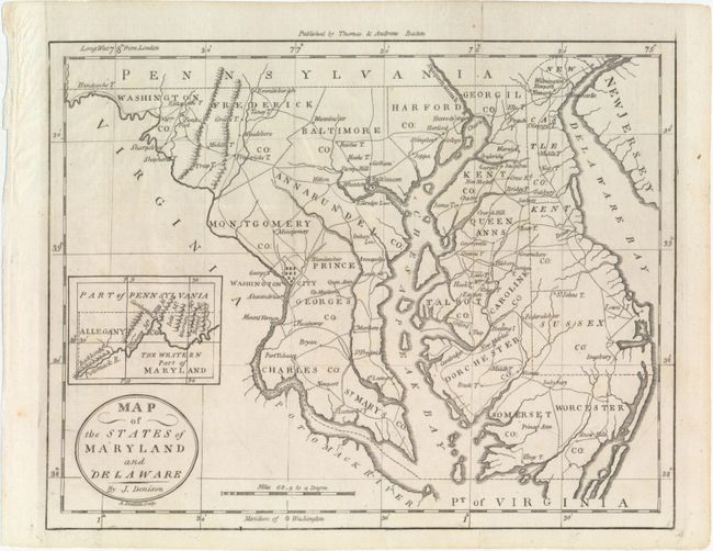 First state of this detailed map that includes all of the Chesapeake Bay and locates Washington City. At left is an inset, The Western Part of Maryland, that names the Potomack River and several mountain ridges. Counties are named and delineated. The map also shows towns, roads, topography, and good watershed detail. Drawn by James Denison, engraved by Amos Doolittle, and published by Thomas & Andrews, Boston.