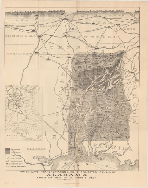 This detailed map of the state shows the population and resources of each county including coal, iron, lime, cotton and wood. It depicts the transportation network in the state including railroads, rivers, and proposed canals. At the top of the map is an interesting and distorted bird's-eye view of the upper Midwest to as far north as Minneapolis and Milwaukee. An inset at left depicts numerous shipping routes out of Mobile. Originally published in the Mobile Register in 1890, this edition was produced in an 1892 British government trade report stating that "the inclosed [sic] map of Alabama will give more accurate idea of the resources of the State than the most elaborate description could." Lithographed by Harrison & Sons in London.