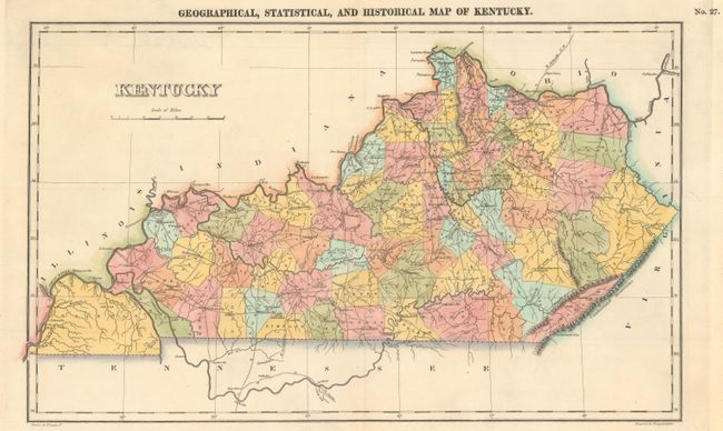 The map is on a full folio sheet (20.8 x 16.5") with English text below giving a brief description of Kentucky's boundaries, productions, rivers, climate, chief towns, manufactures, commerce, education, and religion. The finely engraved map delineates the counties, roads, and major towns. Hickman County dominates the southwest corner of the state, as it has not yet been cut down to form Calloway (organized 1823), Graves (1824), and McCracken (1825). Pilot Knob appears in duplicate in an odd cartographic error. Kentucky and Tennessee are almost always shown on the same map, so it is uncommon to find Kentucky alone during this period. Drawn by Fielding Lucas, Jr. and engraved by Young & Delleker.