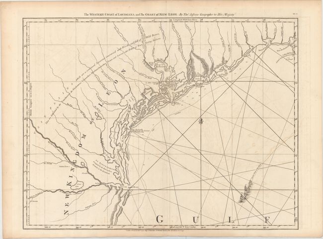 This map depicts the coast of Texas from the Rio Grande to the Sabine River, and was published as one sheet of a sixteen-sheet chart of the whole of the West Indies. First published in 1775, this map was the "principal authority for the Texas coastline" until the beginning of the 19th century, according to Streeter. Jefferys' map is remarkable for being the first map to focus on the Texas coastline, as well as for its overwhelming geographical inaccuracies. The map depicts the rivers, bays, inlets, and marshland along the coast, with soundings indicated in the coastal waters. In the bottom right corner is a fleet of ships with the notation "Ancient Track of the Flotta." Notes are also included in the interior, with particular emphasis on the location of Indian villages. La Salle's settlement from 1685 is also shown.