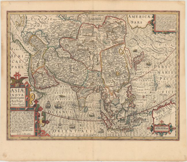 This excellent map of Asia was Hondius’ update of Mercator’s map of 1595. Though it corrected many of Mercator’s errors, the map still has many interesting early depictions. Korea is shown as a very long island. Japan is depicted on the Ortelius-Teixeria model with three principal islands. In India, the Gulf of Cambay is very exaggerated but the shape of Ceylon has been improved. The mythical Chami Lacus appears to the northeast of India. The Philippines are marked as the Philippina Insulae, as well as Archipelagus S. Lazari, Magellan’s original name for the group. The southern coastline of Java is left blank. The northern coastline of New Guinea includes many place names from Spanish expeditions, and there is a note that it is unknown if New Guinea is a part of Terra Australis. Across the Anian Fretum lies part of North America, labeled Americae Pars, with a cartouche notation concerning the searches for a Northwest Passage. The map is richly decorated with strapwork cartouches, ships, and numerous sea monsters.