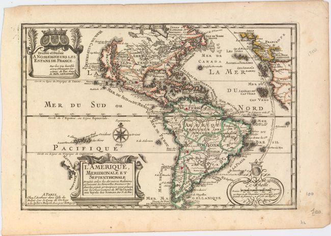 This charming map of the Americas is a reduced derivative of De Fer's classical wall map of 1698 with information gathered from the archives of the Academie Royale des Sciences. The island of California covers the entire west coast of North America north of the Tropic of Cancer with two large imaginary islands off shore. One of the prominent features in northern Mexico is Les Mine de S. Iean et de Ste. Barbe, the legendary Santa Barbara mines of the Chihuahua-Durango region. There are several large spurious lakes on both continents. A partial coastline of New Zealand appears beside the title cartouche. The map is richly decorated with three cartouches and a compass rose. This is the second state.