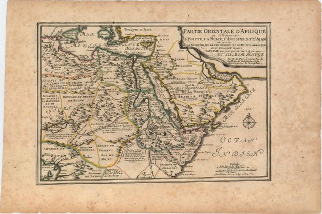 This map covers from Tunis and Benin through the horn of Africa and all of the Arabian peninsula. It is densely engraved with detail of the topography and includes numerous notations concerning the inhabitants. The source of the Nile is shown in a lake in Abyssinia and the Nile and Niger rivers are shown connected. This is the first edition.