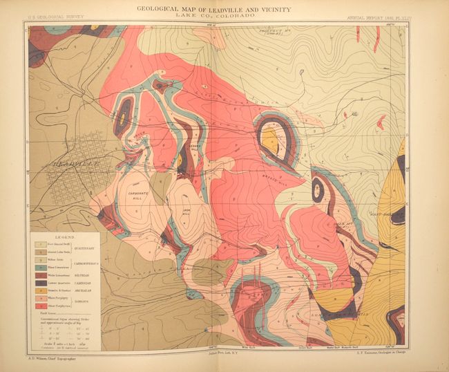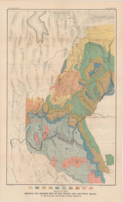 This map is a very detailed and strongly colored geological map from the U.S. Geological Surveys. It details the region from Prescott (Ft. Whipple) and Camp Verde north through the Grand Canyon and Marble Canyon, today's Canyonlands National Park, Moab, and the southern portion of the Great Salt Lake. The map locates the Wasatch and Uintah Mountains, the Bad Land Cliffs (Book Cliffs), the San Juan River, etc. and has remarkable detail of the watershed and topography. This thematic map identifies ten geological units through color including: Tertiary, Cretaceous, Jurassic, Trias, Permian, Carboniferous, Silurian, Archaean, Trachyte Rhyolite & Andesite, and Basalt. Engraved by J.H. Renshawe.