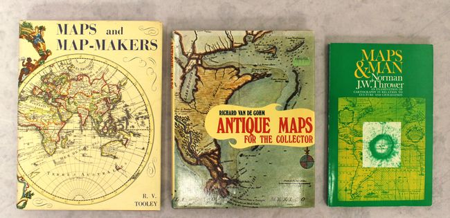 B. Antique Maps for the Collector, by Richard van de Gohm, published 1972, printed color (7.6 x 9.6"). This work is a concise history of cartography, with an examination of the major European cartographers from the 14th to the 18th centuries. The book also discusses printing and coloring techniques, restoration, identification, starting a collection, and includes a glossary of map makers. Illustrated with more than 130 images (some in color), 160 pp. First American edition, published by The MacMillan Co. Hardbound with illustrated dust jacket. Condition: Contents near fine with faint toning along the top of the pages. There is a small chip at top on the back of the dust jacket.