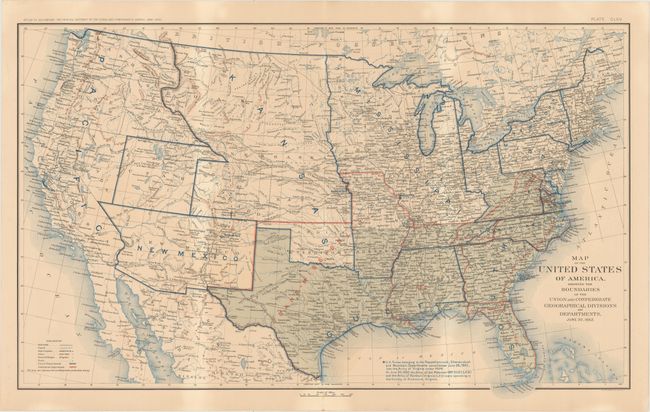 This lot of interesting Civil War sheets comes from the government's comprehensive atlas covering the War Between the States. These plates were issued between 1891 and 1895 to accompany the Official Army Records and were published under the Secretaries of War Redfield Proctor, Stephen B. Elkins, and Daniel S. Lamont by Maj. Gen. George B. Davis, assisted by civilian experts Leslie Perry and Joseph Kirkley. The first sheet comes from a series of ten maps tracking changes in boundaries, the position of troops, and the status of Confederate states in six month intervals throughout the course of the war. This is the sheet depicting the nation as it was on June 30, 1862. Changes from the previous map in the series, dated December 31st, 1861, include specifically naming Southwestern Virginia and East Tennessee, labeling a large swath of the Midwest as simply Mississippi, and noting the activities of various armies in Virginia at bottom. The second sheet shows a number of flags, including the nation's flag, the changing Confederate flag, the battle flags for various cavalries, and more. Size varies slightly.