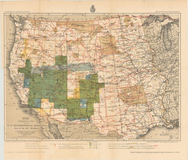 B. Progress Map of the U.S. Geographical Surveys West of the 100th Meridian..., by U.S. Geographical Survey, dated 1882, printed color (22.4 x 17.5"). A remarkable and attractive map that reflects the survey efforts in the West, including the survey seasons of 1869, and 1871 through 1879. It is a detailed representation of the various routes of western expeditions and the important surveys of King (40th parallel), Wheeler, Powell and Hayden. Among the details are the locations of occupied and abandoned posts, astronomical stations, signal service stations, telegraphic lines, and the routes of cattle droves and trains. The progress maps are among the most interesting, informative and useful maps of the West. Condition: Issued folding with faint color offsetting, a binding trim at left, and a tiny binding tear that just passes the neatline.