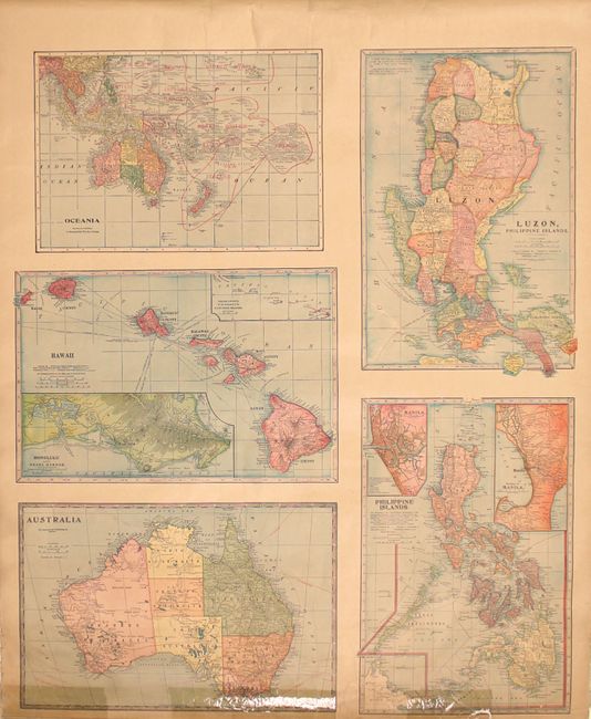 This rare wall atlas contains three sheets, published circa 1935, including a world map entitled Equal-Area Projection of the World (27.2 x 18.2") which is surrounded by photographs of Word War II political figures and their flags including Mussolini, Stalin, Hitler, Hirohito and Roosevelt. The verso depicts the Excelsior Series Map of the United States and Alaska. The second sheet contains a Map Featuring Countries of the Far East (30.0 x 26.6") with additional smaller maps of the southern Pacific, Australia and Hawaii on verso. The third sheet contains a Map of Michigan and various population data. The three sheets are joined together by a metal strip at top.