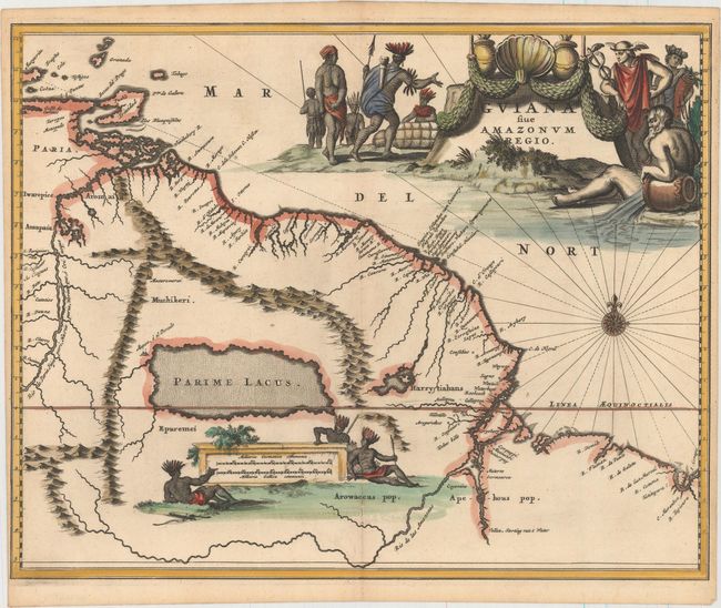 This decorative map covers the region from the Isla Margarita in the northwest to the coast of northern Brazil near Sao Luis east of the Amazon delta. The map is based on the work of Hessel Gerritsz who traveled in the region in 1628. The map locates at its center a large mythical inland sea, Parime Lacus, on whose northwestern shore lies the fabled city Manoa, o el Dorado, or the golden city of the Incas. The search for this city led many explorers, including Sir Walter Raleigh, on wild adventures through the jungles. The map is richly embellished with a very large title cartouche and distance scale, both flanked by native Brazilians, a river god representing the Amazon, and Mercury.