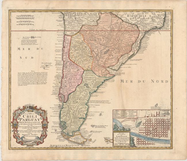 Handsome, detailed map covering the southern part of the continent based on the cartography of Delisle and the information gleaned from the voyages of Brouwer, Narbouroug and Beauchesne. Filled with information of settlements, missions, forests, rivers, volcanoes and mountains. In the lower right corner is an inset plan of the city of Santiago and in the lower left corner is a decorative title cartouche incorporating an erupting volcano.
