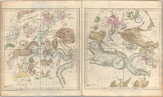 Complete celestial atlas with eight charts of the constellations. This popular star atlas was intended for the general public, rather than for professional astronomers. Only the brighter stars and nebulae, and their allegorical forms, are depicted on the charts. The stiff paper covers include a vignette of astronomers using a telescope. Charts include: