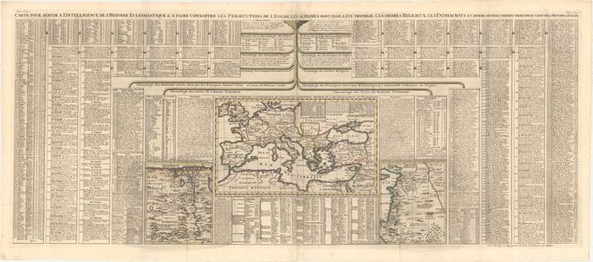 Very interesting large French chart illustrating the various religious divisions in Europe and the Mediterranean. At center is a map (13.5 x 8.5") of Europe with adjacent maps (5.7 x 7.2" each) of Egypt and the Holy Land. All surrounded by tables of text describing the persecutions of Christians, chronology of various kingdoms, popes, etc. On two joined sheets as issued.