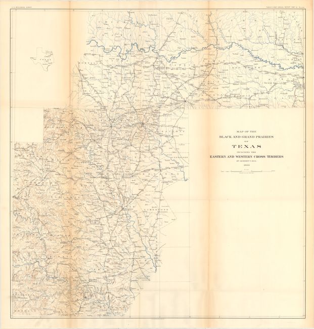 Map of the Black and Grand Prairies of Texas Including the Eastern and Western Cross Timbers (29 x 30.3"). Map covers east-central Texas including Austin, Dallas and Fort Worth. Provides excellent detail of topography, drainage, and railroads. Delineated by county and drawn on a scale of 10 miles per inch.