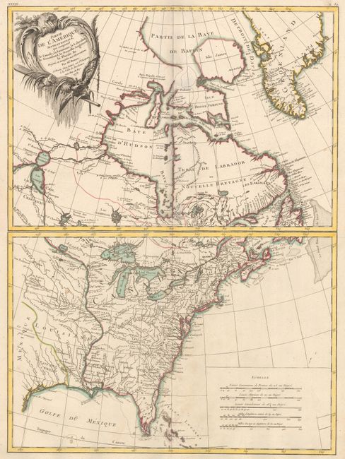 Finely engraved pair of Revolutionary War maps covering the Eastern parts of North America. This map was first issued in 1771; here it is bears the date of 1773, the second state according to McCorkle. The first sheet contains the decorative title cartouche, and it covers eastern Canada and Greenland from the bottom of Hudson Bay, northward beyond the Arctic Circle to about 70 deg. N. Latitude. It includes an interesting depiction of a passage between Lake Winnipeg and Hudson Bay alluding to a possible passage to the Pacific. The second map covers French Louisiane and the British Colonies with their western boundary on the Mississippi River. Nice detail, particularly of the French forts and Indian villages.