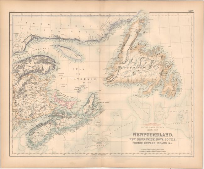 B. British North America Sheet 1, East. Newfoundland, New Brunswick, Nova Scotia, Prince Edward Island &c., by Archibald Fullerton & Co., from The Royal Illustrated Atlas, Of Modern Geography, circa 1872, printed color (20.7 x 16.4). This map of Newfoundland, New Brunswick and Nova Scotia shows topography by hachure and gives great detail of place names and political boundaries. The fishing banks off the coasts are also well delineated. The railways extending through New Brunswick and Nova Scotia are identified with a numbered key above the title. Compiled by J. Hugh Johnson. Condition: Light toning along the edges of the sheet, which is somewhat cockled.