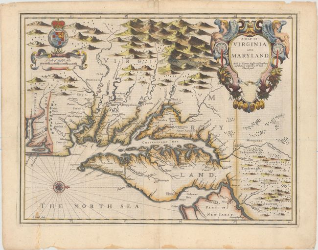 The English text verso gives an up-to-date description of the colonies, adding to the appeal of this sought-after and decorative map engraved by Francis Lamb. Oriented with north to the right, the map shows both the Chesapeake and Delaware Bays and Part of New Iarsy. Following John Smith's general outline, Lamb draws upon Augustine Herrman's landmark map for improved geography and English nomenclature, as well as its depiction of the Delaware Bay and River. The boundary between Virginia and Maryland on the eastern shore, settled in 1688, is depicted with the Herrman-like usage of a double line of trees. The map is beautifully decorated with the Royal Arms of England and a large elegant title cartouche. First state with the imprint of Bassett and Chiswell.
