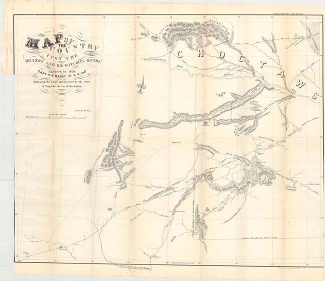 This large and detailed map covers the northeastern part of Texas and a portion of Oklahoma, just north of the Red River, which is noted as Choctaw territory. Filled with details, it includes many place names, wagon roads, forts, reservations, woodlands, bayous, etc. From the 1854 explorations of Capt. R.B. Marcy of the 5th Infantry.