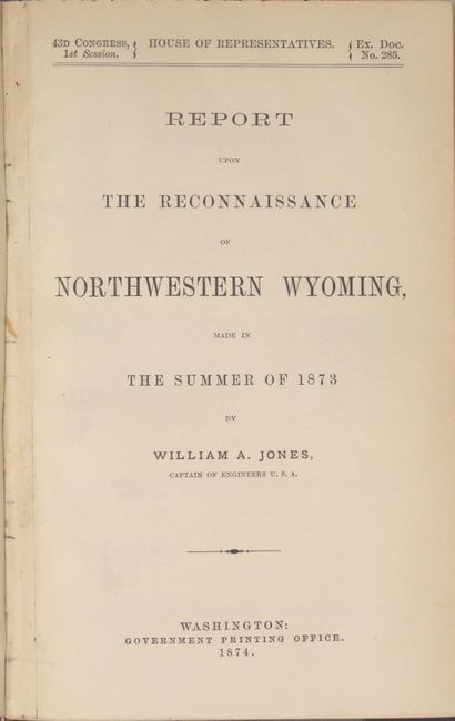 The map is accompanied by the original report which includes "Map of a Military Reconnoissance of North Western Wyoming" (30.3 x 17.3") and 49 untitled maps which show the route of the reconnaissance. 8vo, rebound in modern maroon and grey library buckram with marbled endpapers.