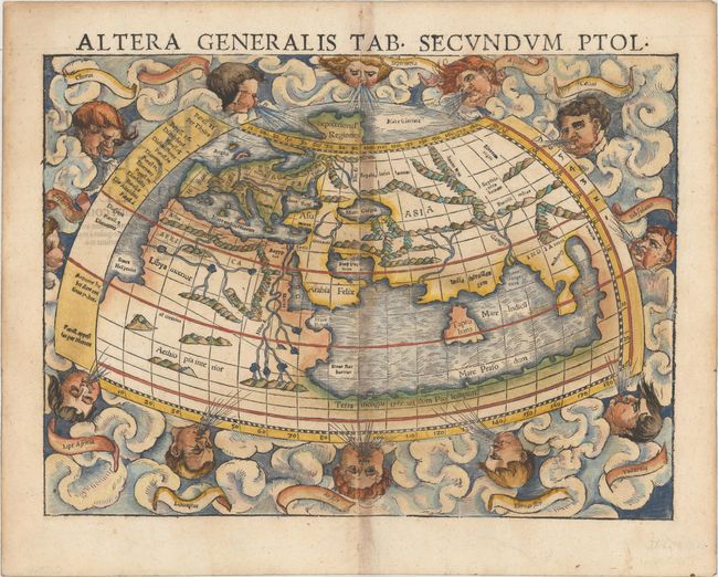 Clouds and eight named wind heads surround Munster’s woodblock world map. It displays the prevailing conception of the world geography prior to the discovery of the New World and according to Claudius Ptolemy. The continents are oddly shaped and all connected by a great southern continent Terra incognita secundum Ptolemaeum. There is a very large Taprobana (modern day Sri Lanka) in the enclosed Indian Ocean, and the Indian subcontinent is severely truncated. Only the northern part of Africa is shown with the Nile originating from a series of lakes in a large mountain range. This is the second edition with the fine vertical crack line across the right-hand part of the map. Latin title and text on verso.