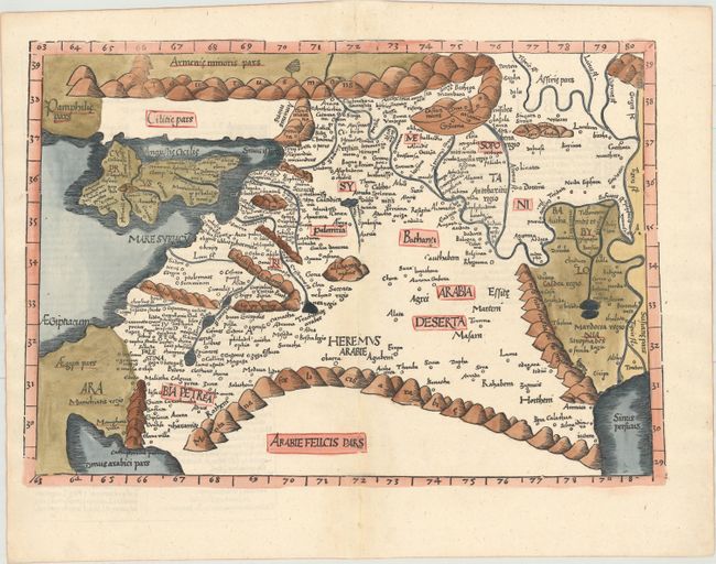 Woodblock map illustrating the Ptolemaic concept of the Middle East, between the Mediterranean, the Red Sea and the Persian Gulf, extending from Cyprus to Babylonia. Rivers, place names, and rope-like mountains fill the map. The map is reduced from Martin Waldseemuller's map, with a few changes, including a reduction in size of the bay north of Jaffa (here ioppe). Title is on the verso along with Latin text. This edition was printed by Gaspar Treschel and edited by Michael Villanovus (known as Servetus). Servetus was charged with heresy by John Calvin in 1553, in part due to the text in this atlas. The courts found him guilty and sentenced him to burning at the stake, atop a pyre of his own books, including this atlas.