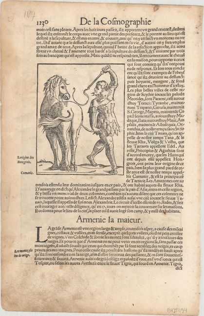 Woodblock map of the region between the Black and Caspian Seas including Georgia, Armenia, Azerbaijan and Russia up to about Volgograd. Strongly engraved, it features the rivers, forests, mountains and major cities. French text on verso, along with an image of a Hun with his horse.