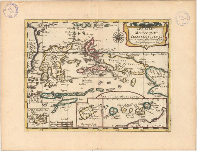 This lovely map of the East Indies is from a French edition of Sanson's popular pocket atlas that was engraved by A. Peyrounin. The map covers the famous Spice Islands and includes insets of Banda, Bachian and the Moluccas. Terre des Papous is rendered as an island separate from New Guinea, following an error that began in the 1590s. The map is beautifully engraved and decorated with a strapwork title cartouche and a compass rose. This is the first state.