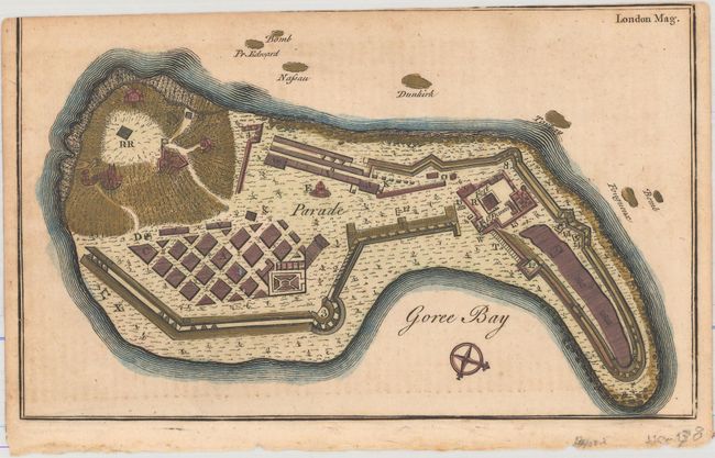 B. [Untitled - Goree], from London Magazine, published 1759, hand color (7.9 x 4.9"). This small plan of the island of Goree in Senegal was published in the October 1759 issue of London Magazine. It shows the French fortifications on the island, now known for its House of Slaves, a museum covering the Atlantic slave trade. Reference: Jolly #LOND-177. Condition: A nice impression with minor offsetting from an opposing page of text and part of the neatline trimmed away at top, likely as issued.