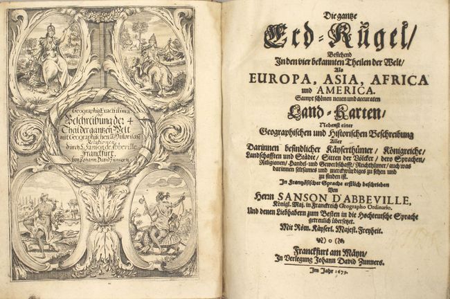 This is the German edition of Sanson's quarto atlas of the world, Description de Tout l'Univers, published by Johann David Zunner. The maps for this edition were re-engraved based on Sanson's original quarto maps. This atlas covers all four continents with a total of 63 maps: