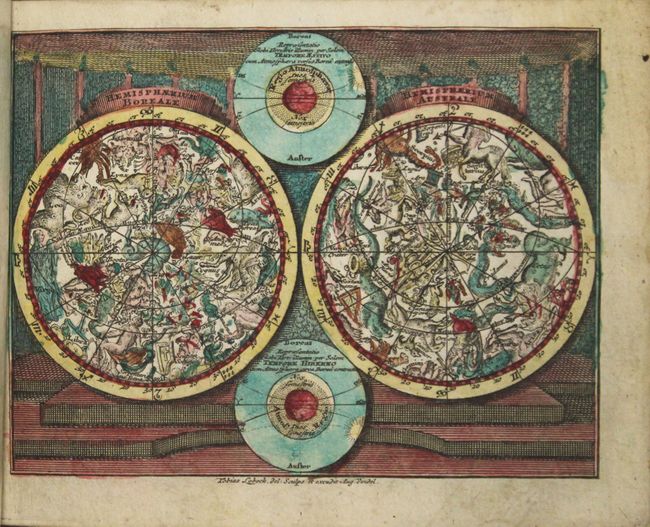 Fine pocket atlas with decorative maps in full original color. It opens with an allegorical frontispiece, followed by a title page in an architectural cartouche, both drawn by Gottfried Eichler, junior. The maps include the celestial and terrestrial hemispheres, the continents, and detailed maps of western and eastern Europe. Most maps are embellished with a fine title cartouche. The maps are followed by a list of maps and a Geographie (72 pages) printed for Lobeck by Johann Michael Spaeth. This atlas was a collaborative publication between Tobias Conrad Lotter and Tobias Lobeck, first published in 1747 with an almanac. The atlas remained in use for many years, with the maps reprinted and with new maps added, but the title page continued to report 29 maps. The maps present are: