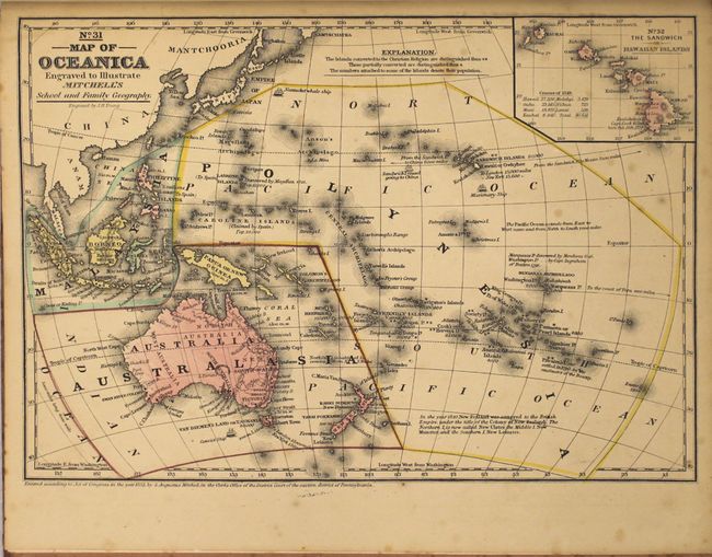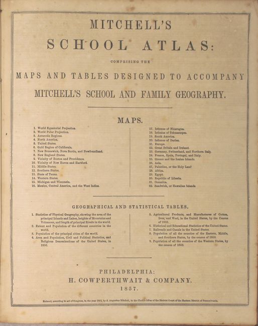 A nice example of Mitchell's famous school atlas complete with 32 maps, many double-page, along with tables and statistics. All of the maps have blank versos. The double-page map of the United States features large Utah, Nebraska and New Mexico territories. Washington and Oregon territories extend to the Continental Divide. This map also has an inset of the Gold Region of California. The atlas also includes the desirable "No. 13 Map of the State of Texas." Hardbound with pictorial paper over boards. This is the fourth revised edition, published by Thomas, Cowperthwait & Co.