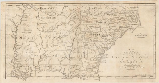 The second edition of this interesting map that was "Corrected by the Author." It details the South during the tumultuous period following independence when the states and central government fought over control of the western land claims. Seven of the 13 original states had claims to areas in the West (those lands between the Appalachian Mountains and the Mississippi River). These so-called landed states had a great potential advantage over the six landless states. It was assumed that the future sale of western lands would enrich the landed states and possibly allow them to operate without any form of taxation. The landless states feared that they would lose residents and dwindle into insignificance. The matter was further complicated by the fact that the claims often overlapped one another, which pitted one state's interests against another. On this map the region of much of present-day Mississippi and Alabama is labeled Mississippi Territory, with the coastal region named West Florida. A dotted line running north-south through present-day Georgia demarcates "All West of this line is claimed by the United States & also by Georgia." The overlapping claims were resolved when Spain gave up its claim to West Florida in 1795 and Georgia finally relinquished its claim in 1802 (the last of the landed states to surrender its claim). Another interesting feature of the map is the notation of the number of men in several of the Indian tribes in the western territories. It is from the same plate as Wheat & Brun #496 with corrections by Bradley.