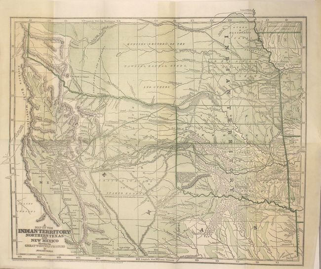 Wheat describes this as a "cartographic landmark" of the western territories and covers the area from Missouri, Kansas and Louisiana to the Rocky Mountains. It is the first edition, published just before the more common Morse and Breese atlas map, also dated 1844, but published in 1845. The map shows the northern part of the Republic of Texas reaching along the Rockies and has quite a bit of Indian Territory as well. New Mexico is shown, with Santa Fe as the destination of the route of the Santa Fe Caravans. The map has many tracks of explorers and other routes shown, with topography, towns, villages, smaller villages and ranches, Indian villages, forts, trading posts, ruins, springs, and camps. This would have been a very valuable map for anyone considering traveling across the prairie in the mid 19th century. The map is still bound into the first volume of the work which includes 320 pages and 3 plates. Hardbound in brown cloth with gilt illustration on front cover and gilt title on spine.
