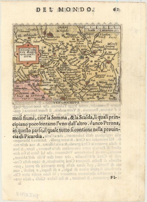 Appealing miniature map of the old region of Vermandois in northwestern France extending from Peronne in the west to Guise in the east, now included in the departments of Aisne and Somme. It is oriented with east at the top, and is adorned with a strapwork title cartouche and a distance scale. Pietro Maria Marchetti produced the second pocket atlas based on Abraham Ortelius' folio Theatrum. It is often referred to as the plagiarized version of the Epitome. The copper plates are closely copied from those of Philip Galle's 1593 Italian edition. On a full sheet of Italian text measuring 5.6 x 7.5".