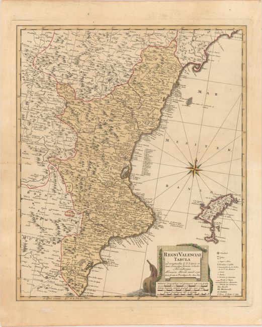 This detailed and very uncommon map of the region of Valencia extends to the island of Ibiza in the Mediterranean. A legend at bottom right identifies cities of various sizes, forts and castles, markets, abbeys, and more. The large stone title cartouche is draped with a garland and depicts the bow of a ship. A compass rose orients north to the top right corner of the chart.