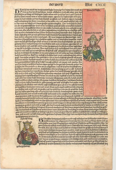 A nice leaf with woodblock illustrations on both sides including a doctor, Saint Stephan, Holy Roman Emperor Henry IV, King Rudolf of Saxony and a lovely view of a medieval church. German text.