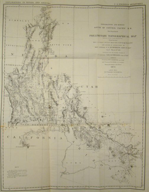 This map is labeled preliminary, as it was the forerunner of what would become one of the most important surveys of the American West. The 1870s was a period of intense effort, by such prominent people as Clarence King, Ferdinand Hayden, and John Wesley Powell, to advance the geographical knowledge of the West. These various surveys presented a threat to the Army's supremacy in the field of mapping and to the related appropriations from Congress. As a result of these pressures, the Army Corp of Engineers developed a plan to systematically survey the entire West which became the U.S. Geographical Surveys West of the One Hundredth Meridian. Lieutenant George Wheeler was chosen to head this immense project largely as a result of the surveys he conducted in Nevada and Arizona.