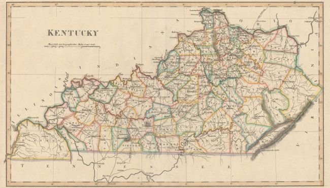 This is an uncommon German edition of Carey & Lea's map of Kentucky with related text below the map image. The atlas was issued in six editions in English, French and German between 1822 and 1827. The map depicts a surprisingly substantial network of roads in the state along with early town, rivers, and topography. County configuration is current to 1820 with the southwestern part of the state occupied entirely by Hickman County. In 1821, the counties of Graves, Calloway, and McCracken would be organized from Hickman. On a full folio sheet that measures 20.4 x 17.9".