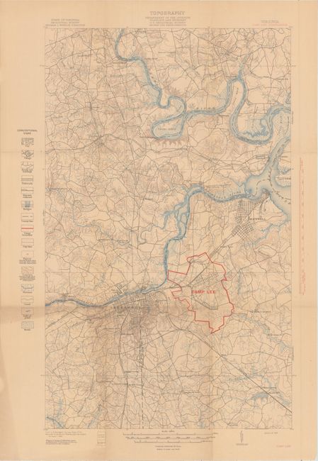 This 40 page bulletin, authored by Albert W. Giles, describes the physical features of eastern Virginia, its natural resources, and the region surrounding Camp Lee. Included with the text are 20 plates of illustrations including two large USGS folding maps at the back: Camp Lee Quadrangle (13.7 x 22.5") and Amelia Quadrangle (14 x 17.5"). The report's frontispiece is a 20 x 7" panoramic photograph of a portion of Camp Lee. Published by the Virginia Geological Survey.