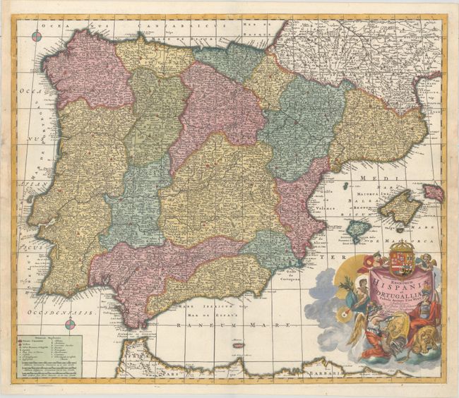 A large and decorative map of the Iberian peninsula covered with great detail, extending to Ibiza, Maiorca, and Minorca. The title cartouche is surrounded by allegorical figures and the Royal Spanish arms. A legend at lower right identifies cities of various size, archbishoprics, abbeys, universities, and more.