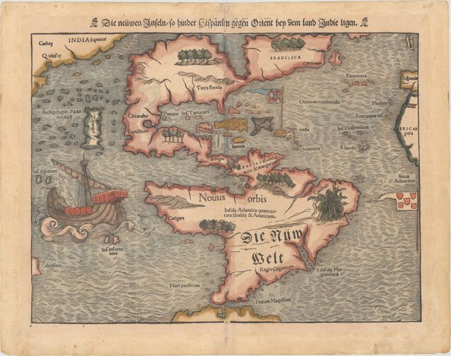 This map of the New World is often credited with popularizing the name America due to the popularity of Munster's Cosmographia and the numerous editions published in the sixteenth century. The influence of Marco Polo's 13th century explorations in Asia are evident with the 7448 islands in the North Pacific and Zipangri (Japan) shown only a short distance off the western coast of North America. The North American continent is very oddly shaped without a California landmass and the eastern region is nearly bisected by a body of water, known as the Sea of Verrazzano. The Yucatan is still shown as an island, Cozumel is named nearby as Cozumela, and the lake at Temistitan (not named in this state) is connected to the Gulf of Mexico. South America has a large bulge on the western coast, the Amazon River is very short, and cannibals inhabit the continent shown with the name Canibali next to a gruesome vignette with human limbs. The map is very decorative with Magellan's surviving ship Victoria appearing in the Pacific. The flags of Spain and Portugal depict their respective spheres of influence in the New World. This is the 5th state per Burden and the 4th state per Kershaw, with the place name Temistitan and Insula Atlantica in South America. German text and woodcut illustration on verso.