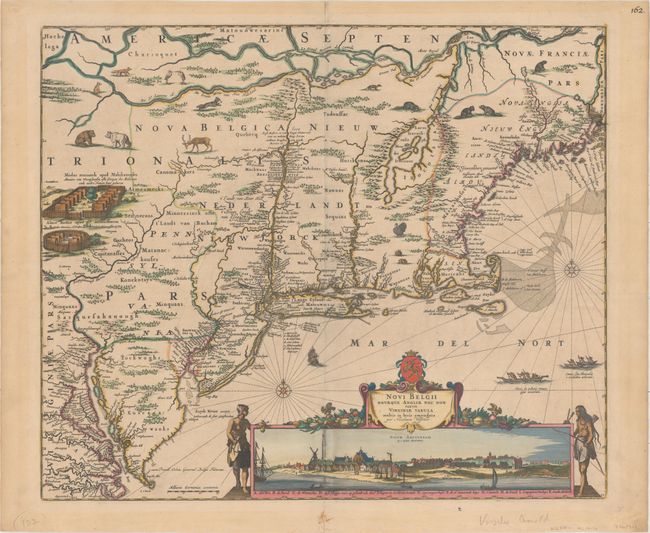 This landmark map, one of the most important in the Jansson-Visscher series, formed the basis for the mapping of New England for nearly one hundred years. It is based on Jansson's map of 1651 with Visscher's significant addition of a view of New Amsterdam, the Dutch settlement on Manhattan Island. This view is one of the earliest images of New York City showing the southern tip of Manhattan Island as a small settlement dominated by a Dutch fort and the buildings of the Dutch West India Company. This fascinating view is based on the Albertina drawing, discovered in the Albertina Collection of the Austrian National Library in 1991, and is believed to have been used to illustrate the text of Adriaen van der Donck's Remonstrance. The Albertina drawing depicts the struggling Dutch colony of New Amsterdam circa 1648, and was designed to substantiate Van der Donck's plea to the States-General for additional support for the colony. Although the buildings, structures, and layout are nearly identical in Visscher's view, the appearance of the town was beautified to accomplish a very different goal: encouraging emigration to the new colony.