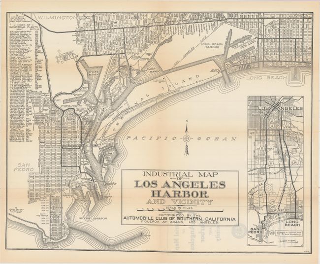 A. Industrial Map of Los Angeles Harbor and Vicinity, circa 1922, black & white (20.0 x 15.8"). Map features San Pedro and Long Beach and details the numerous industrial companies who occupy the inner harbor. A table at left lists the various company names and the associated berth numbers. An inset map at right shows the driving distances from downtown to points south including San Pedro and Long Beach. Condition: Issued folding with light toning along the folds. (B+)