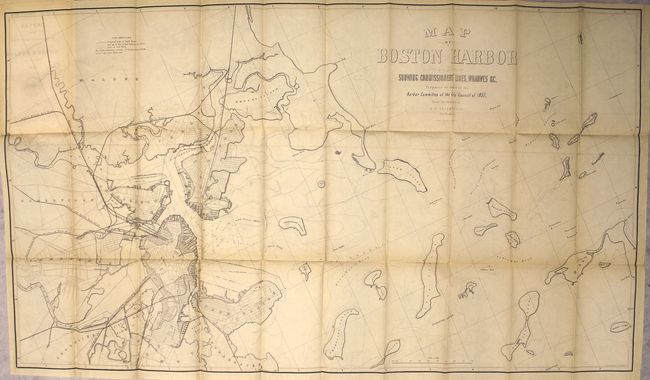 This attractive chart depicts Boston Harbor and the surrounding vicinity and was issued for the Harbor Committee of City Council. It shows wharves, shoals, islands, and railroads with the shaded portions of Boston, South Boston, East Boston and Charlestown reflecting the harbor infilling to accommodate growth. The map is bound into the front of the 54 pp. report with 79 pp. appendix and a plate of soundings. The lot also includes an earlier 23 pp. report "Fixing the Line of Private Property in Boston Harbor" (State Senate Doc #8, 1839).