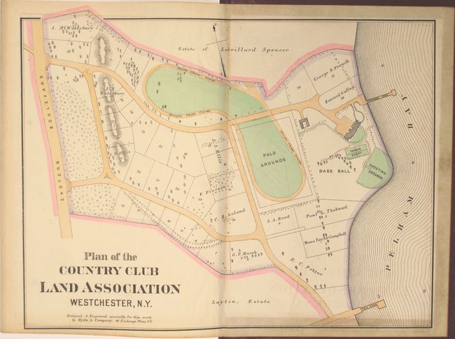 This large-scale map of upper New York City and southern Westchester County was issued on four sheets (each approximately 24 x 31") that would measure 48 x 62" if joined. Published by Hyde & Company, the map is filled with detail including railroads, cable car lines, streets, parks, cemeteries and even individual property owners. The map's detail is further enhanced with attractive hand coloring, which was quite uncommon in the late 19th century. The map is accompanied by two small maps adhered to the boards entitled Plan of the Country Club Land Association Westchester, N.Y. (13.2 x 10.3") and Plan of Travers Island New York Athletic Club Pelham, N.Y. (13.6 x 10.0"), clearly catering this guide book to a wealthy, high society audience. Backed with original linen and attached to maroon leather boards with gilt title on front cover.